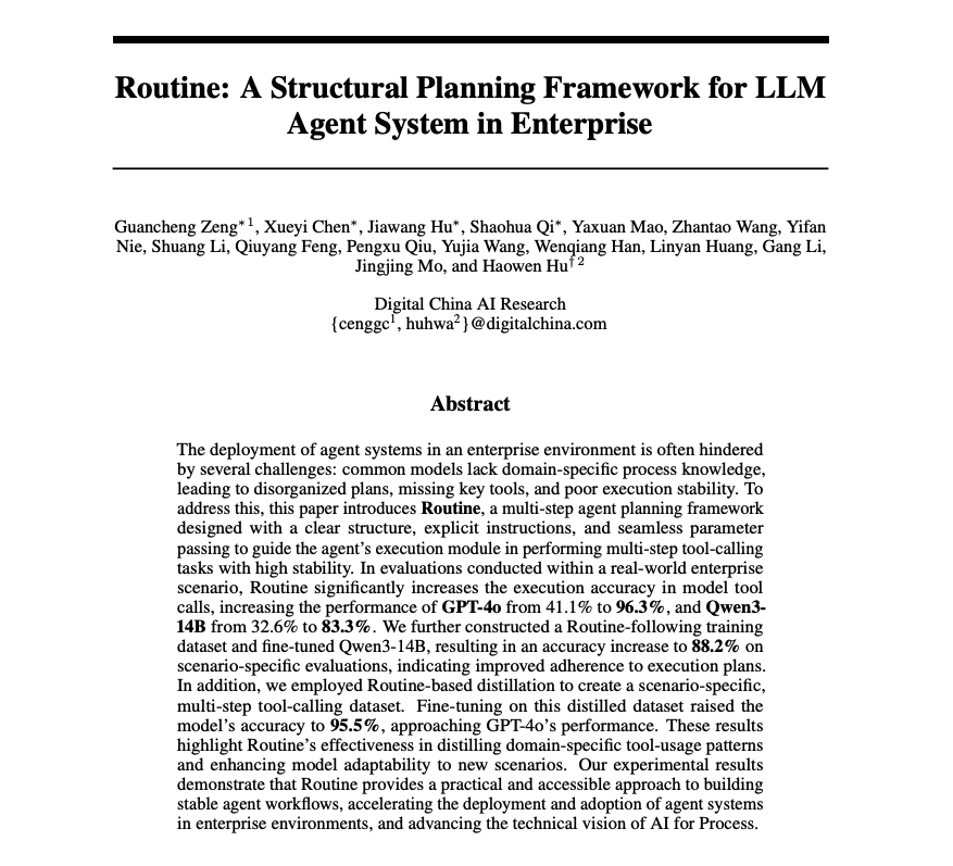 🤖📄 大型语言模型(LLM)代理的结构化规划:Routine框架: Routine框架提供了一种更可靠、更准确地执行复杂任务的方法,旨在提升企业环境中大型语言模型(LLM)代理执行多步骤工具调用任务的稳定性和准确性。图片图片